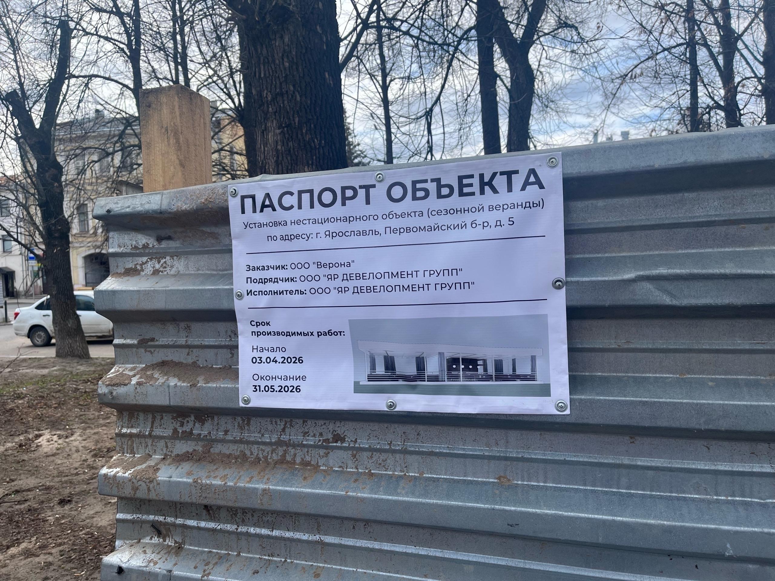 3 апреля 2026 года в Ярославле на Первомайском бульваре, за зданием Волковского театра, начались строительные работы. Участок, где ранее размещалась сгоревшая веранда, огородили профнастилом.